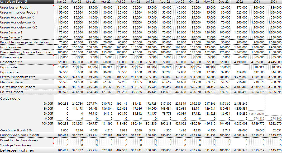 Damit die Programmroutinen einen detaillierten Rentabilitätsplan, Finanzplan, Liquiditätsplan und Bilanzplan generieren, besteht Ihre Aufgabe im Wesentlichen darin, die Netto-Umsätze des Unternehmens zu ermitteln und im Planungsprogramm zu hinterlegen.