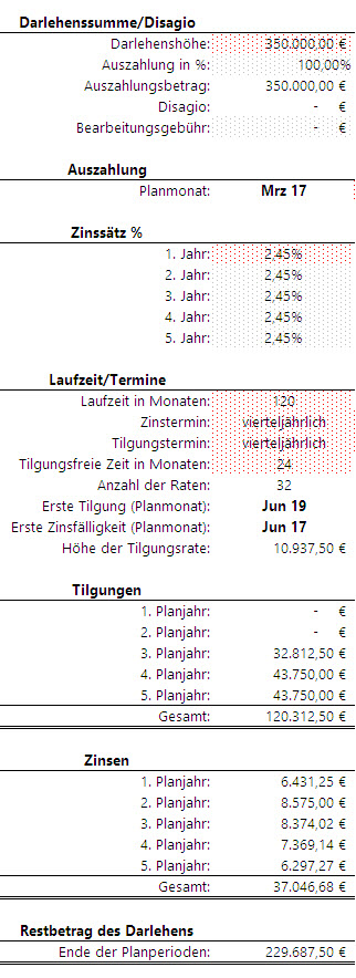 Sie bestimmen lediglich die Höhe der Darlehen, die Laufzeit, die Zinssätze sowie die Tilgungs- und die Auszahlungstermine. Alles weitere erledigt das Programm.