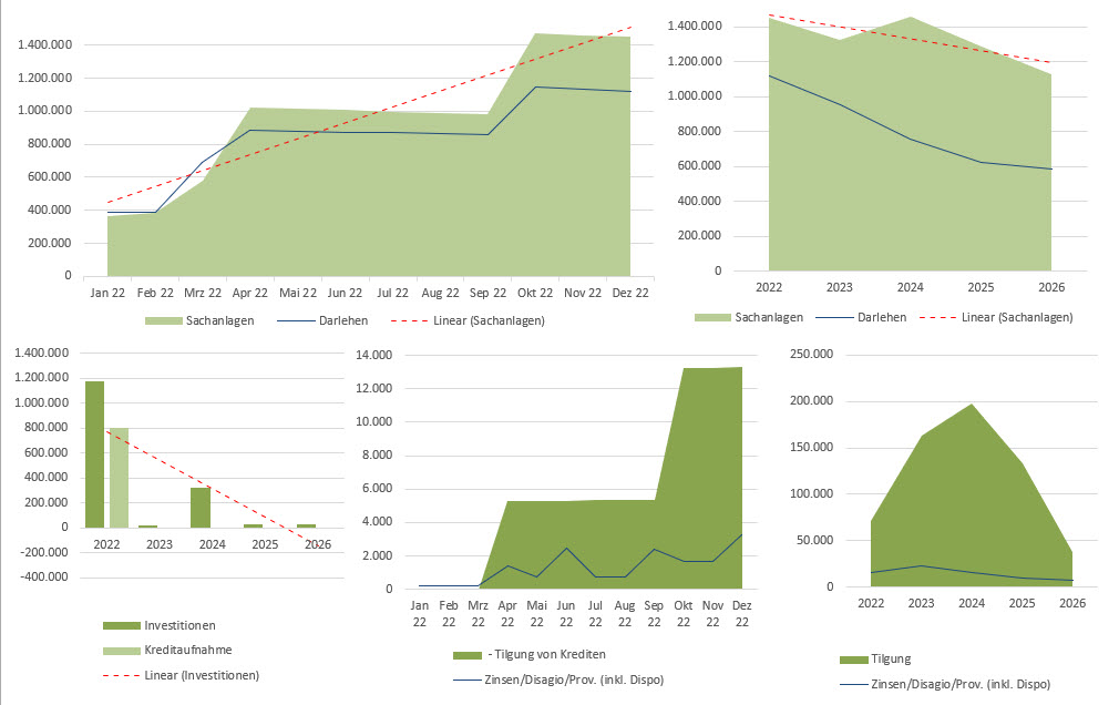 Das Softwareprogramm berechnet die Darlehensschulden, Tilgungen und Zinsaufwendungen und übernimmt die berechneten Tilgungen und Zinsen periodengerecht in den Finanzplan, aktualisiert den Liquiditätsplan, den Rentabilitätsplan sowie die Planbilanz.