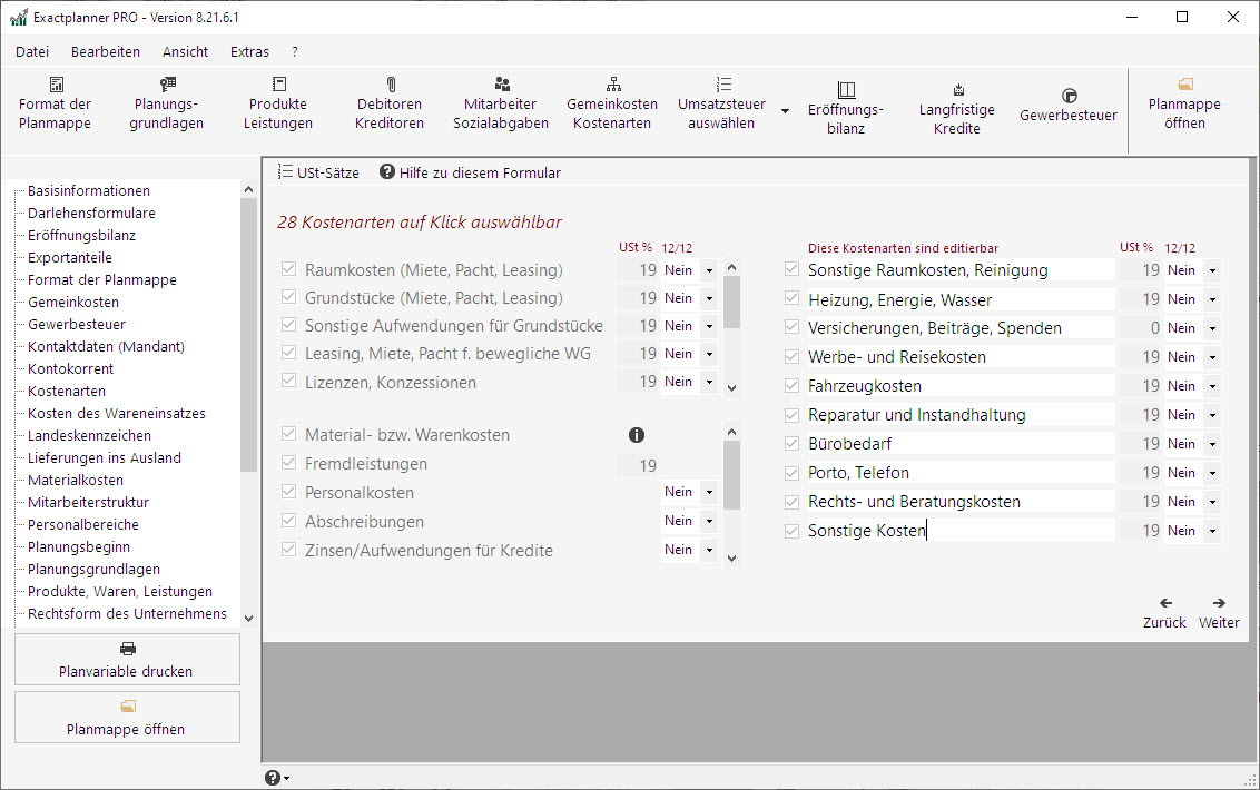 Im ersten Schritt werden die Inhalte der Planmappe festgelegt, insbesondere die einzelnen Kostenarten bestimmt.