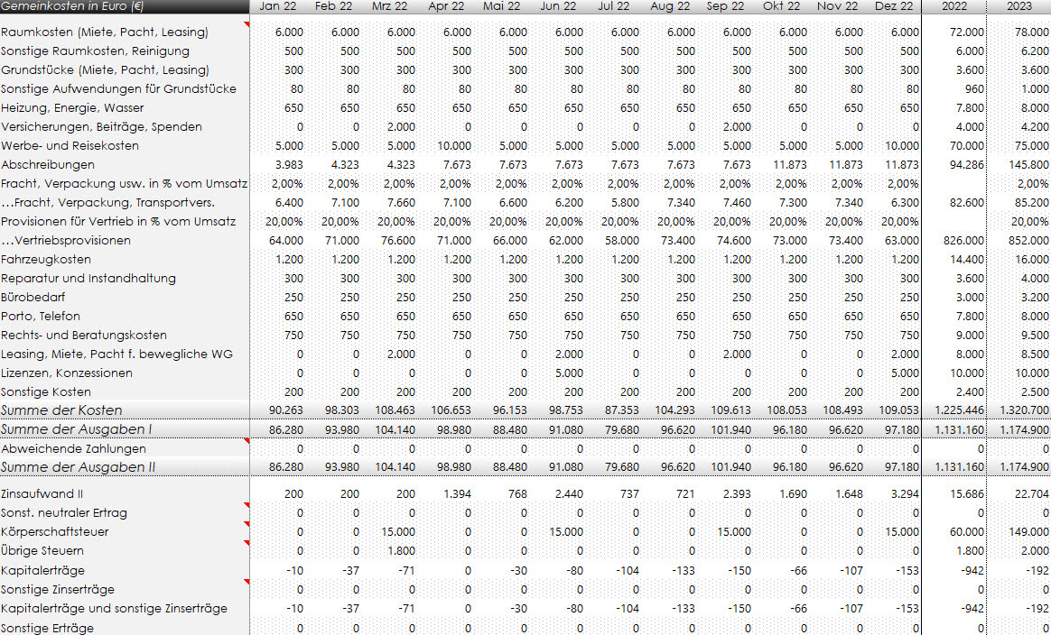 In die auf das Projekt bzw. Unternehmen zugeschnittenen Planungsunterlagen, geben Sie jetzt die geschätzten Umsätze und Kosten sowie die Investitionen ein.